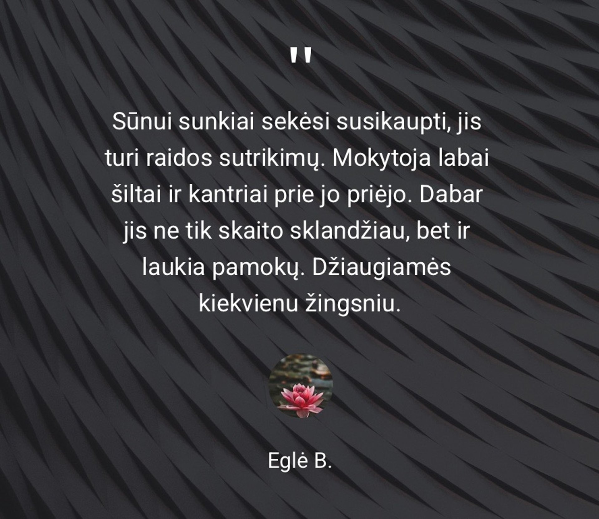 Sūnui sunkiai sekėsi susikaupti, jis turi raidos sutrikimų. Mokytoja labai šiltai ir kantriai prie jo priėjo. Dabar jis ne tik skaito sklandžiau, bet ir laukia pamokų. Džiaugiamės kiekvienu žingsniu.