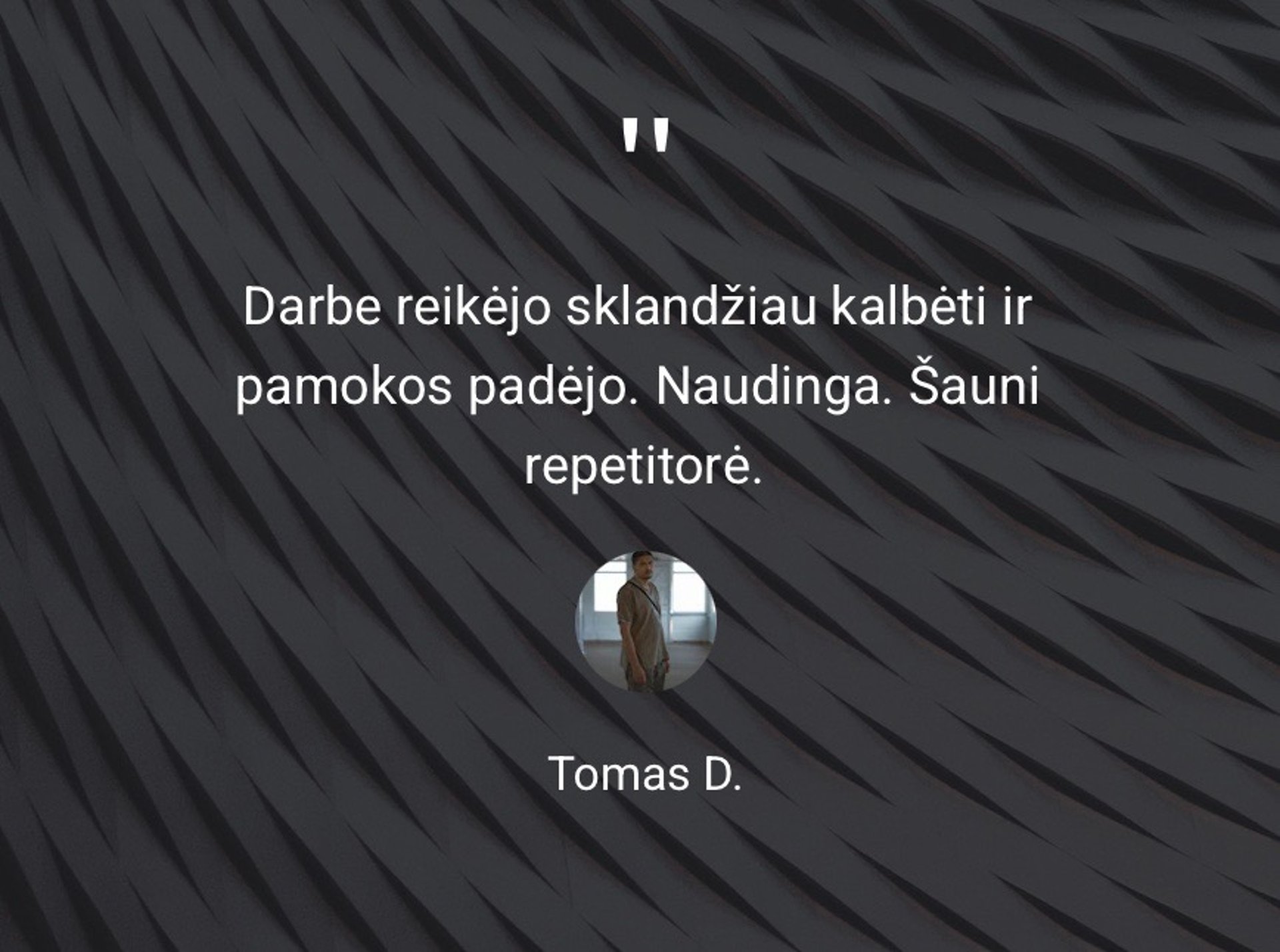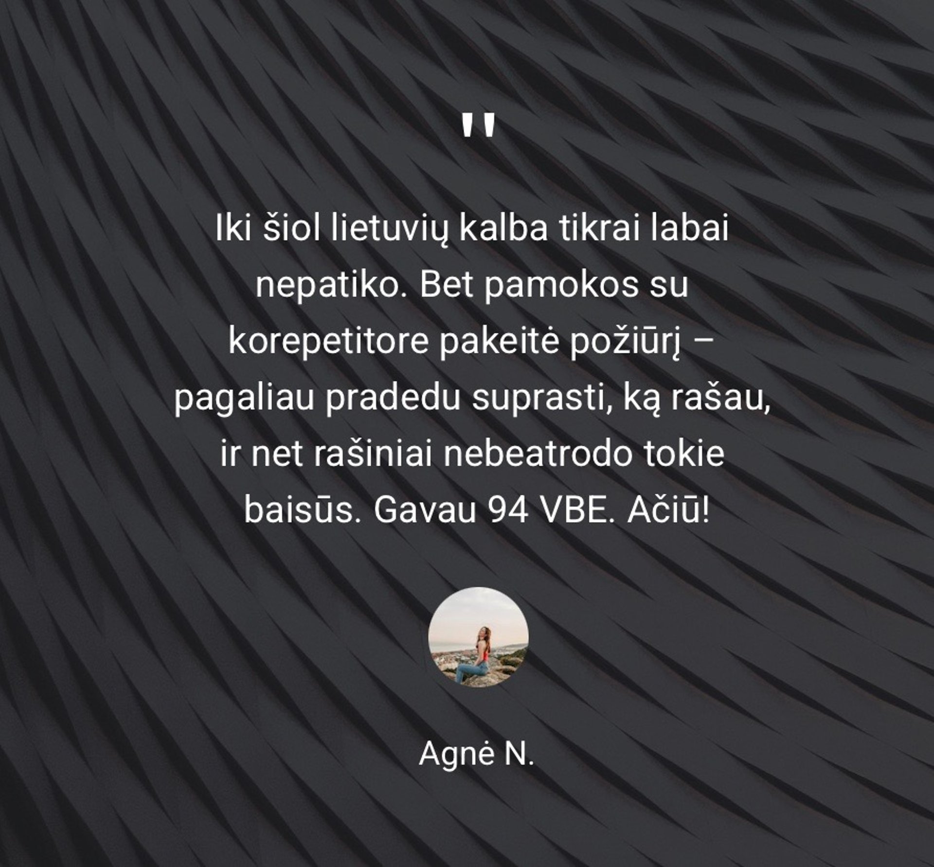Iki šiol lietuvių kalba tikrai labai nepatiko. Bet pamokos su korepetitore pakeitė požiūrį – pagaliau pradedu suprasti, ką rašau, ir net rašiniai nebeatrodo tokie baisūs. Gavau 94 VBE. Ačiū!