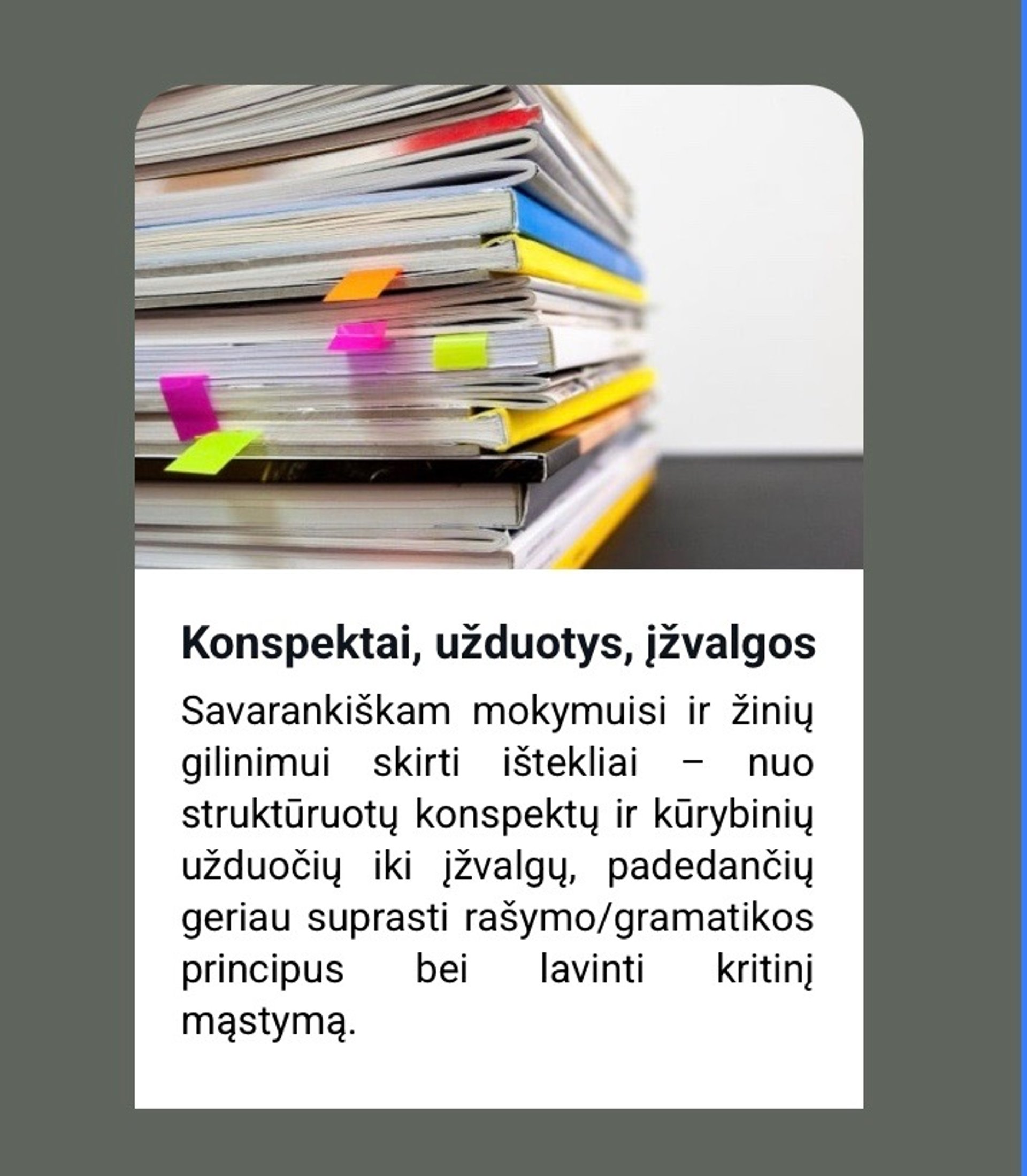 Savarankiškam mokymuisi ir žinių gilinimui skirti ištekliai – nuo struktūruotų konspektų ir kūrybinių užduočių iki įžvalgų, padedančių geriau suprasti rašymo/gramatikos principus bei lavinti kritinį mąstymą.