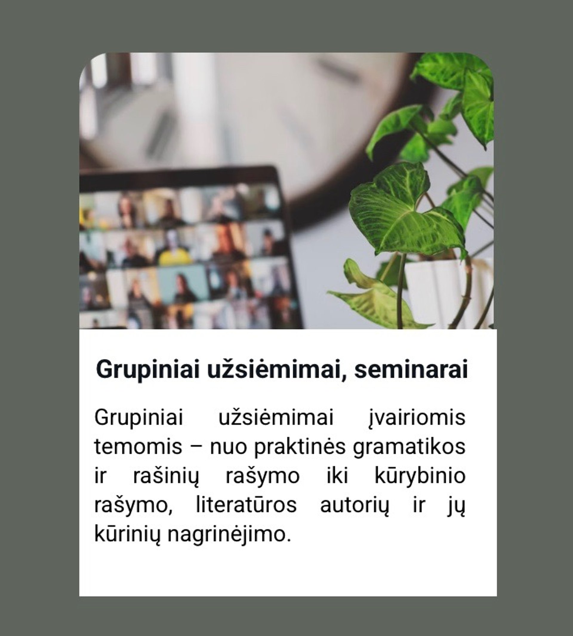 Grupiniai užsiėmimai įvairiomis temomis – nuo praktinės gramatikos ir rašinių rašymo iki kūrybinio rašymo, literatūros autorių ir jų kūrinių nagrinėjimo.